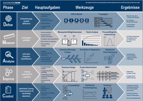 | Tools | Ishikawa-Diagramm, FMEA, Prozessfähigkeitsanalyse, Pareto-Diagramm |